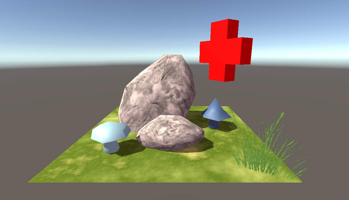 2 different low poly mushrooms, 1 low poly stone, 1 grass billboard texture. (some additional 'models' (roughly combined primitives) are also included, needed for a small demo game