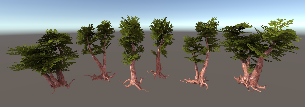 6 different trees - two trees with 1 trunk, two trees with 2 trunks and two trees with 3 trunks